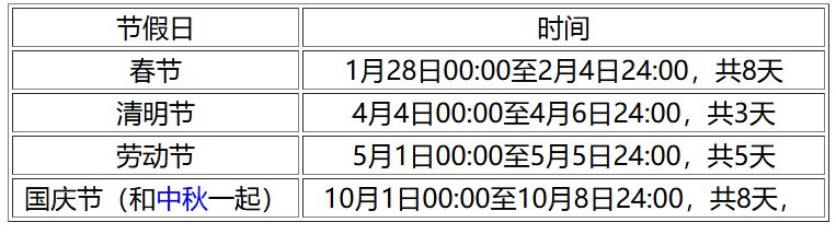下表为这四个节假日的放假安排,除了春节外,其他三个节假日的高速免费通行时间通常和放假时间一致,所以下表也可以给大家作高速免费通行时间的参考(仅供参考)。