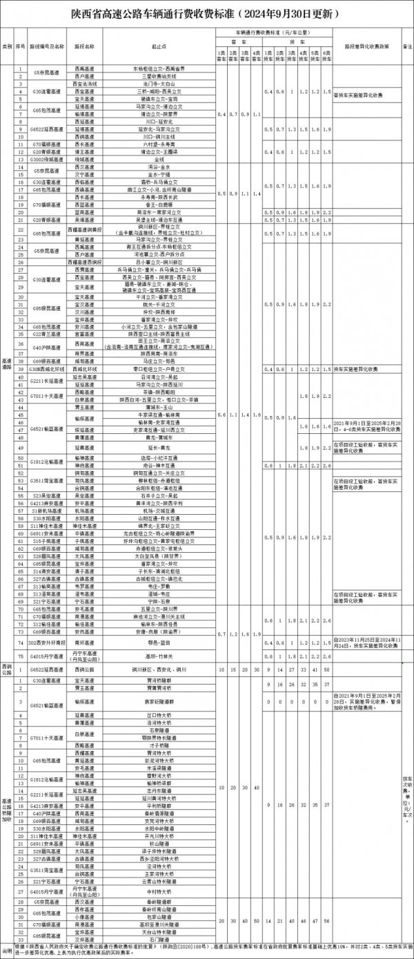 按照《陕西省人民政府关于确定收费公路通行费收费标准的批复》(陕政函〔2020〕188号)、《陕西省交通运输厅 陕西省发展和改革委员会 陕西省财政厅关于转发〈陕西省人民政府关于确定收费公路通行费收费标准的批复〉的通知》(陕交发〔2021〕5号)等文件精神,现将陕西省收费公路车辆通行费收费标准及相关内容汇总如下: