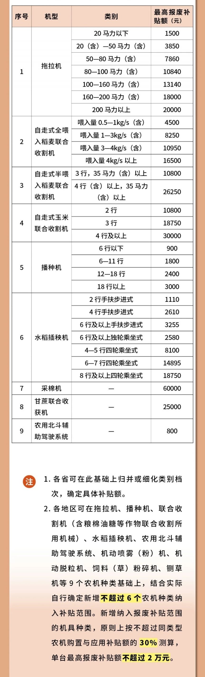 农业农村部、国家发展改革委、财政部等三部门办公厅印发《关于加大工作力度持续实施好农业机械报废更新补贴政策的补充通知》。通知明确的扩大报废补贴范围、提高报废补贴标准政策实施期限截止到2024年12月31日。