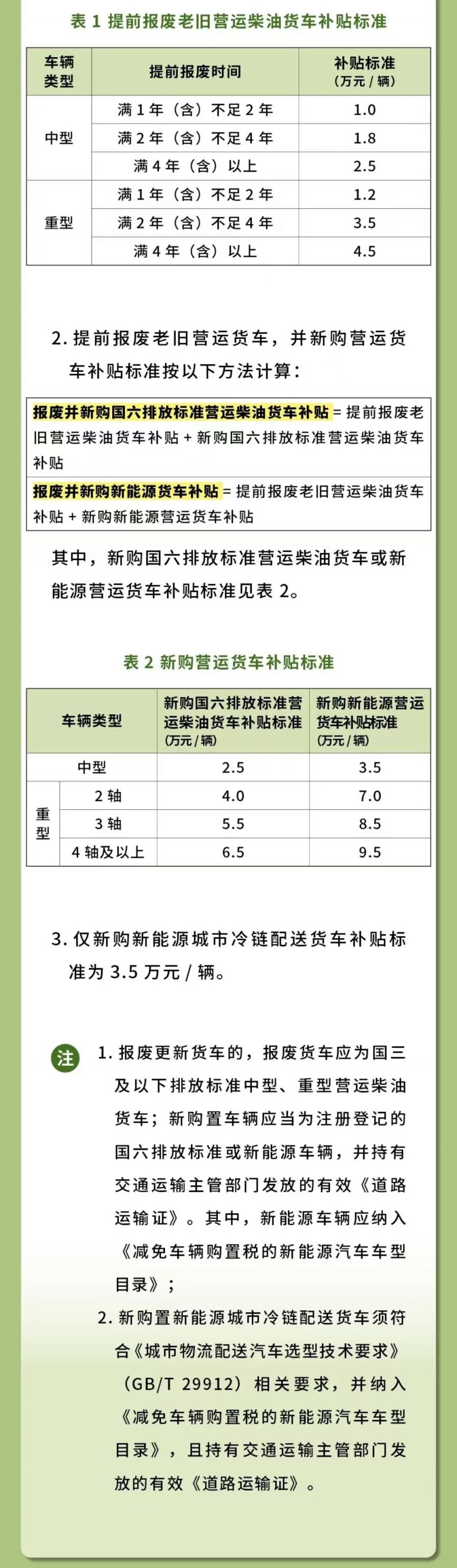 交通运输部、财政部发布《关于实施老旧营运货车报废更新的通知》,老旧营运货车报废更新按照报废车辆类型、提前报废时间和新购置车辆动力类型等,实施差别化补贴标准。补贴政策实施期限为文件印发之日至2024年12月31日。
