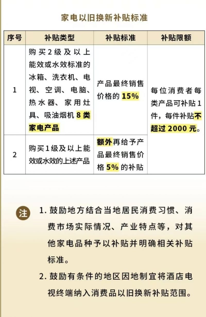 3. "补贴标准" - 根据不同品类和规格的旧产品,补贴金额有所不同。 - 例如,旧空调换新可能补贴500-1000元,旧冰箱补贴300-500元。
