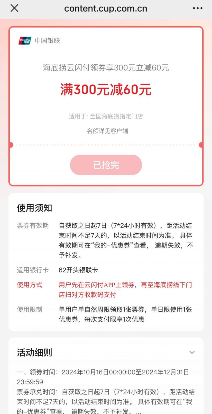 四、活动内容:活动期间,云闪付用户在云闪付APP内搜索“海底捞云闪付领券享300元立减60元”领取优惠券。持卡人领券成功后,前往指定线下活动门店,使用云闪付“扫一扫”并选择62银联卡支付商户订单,即有机会享受单笔订单满300元立减60元优惠。活动期间名额总计5万个,每日投放650个,票券承兑完活动下架。
