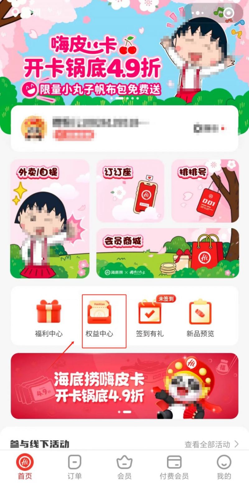 第一步,微信搜索并打开海底捞小程序或APP首页,点击【权益中心】;